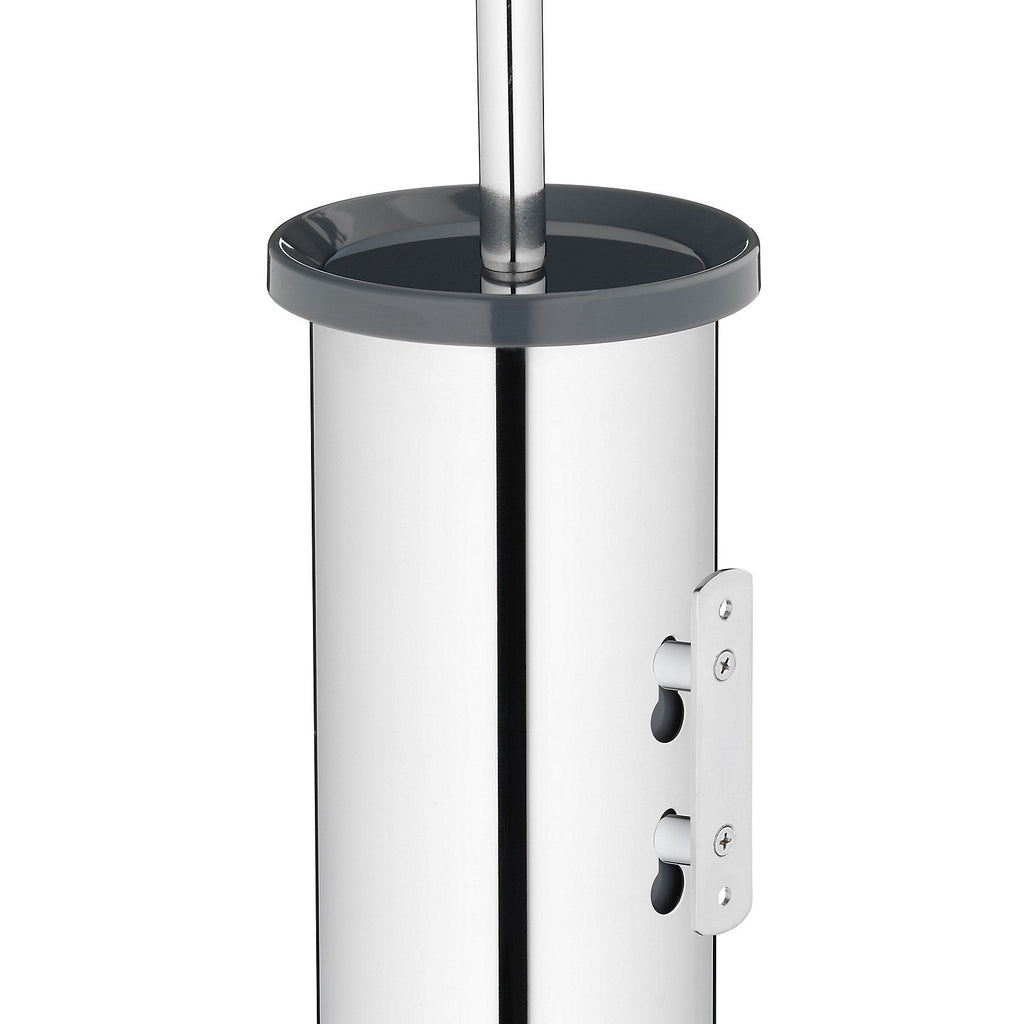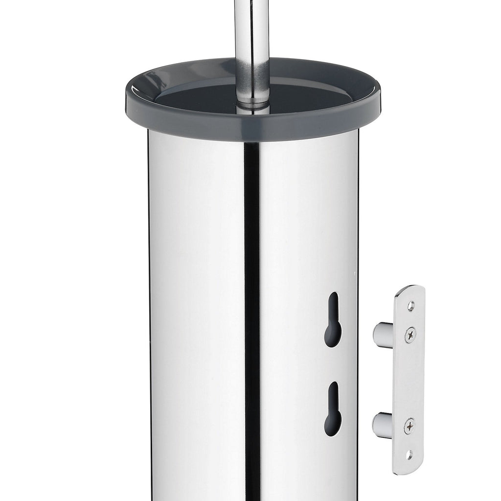 Alor polished stainless-steel wall-mounted toilet brush set — tall, closed, robust. Removable holder for easy cleaning; black inner cup with wide rim ensures upright stability. Height 38 cm.