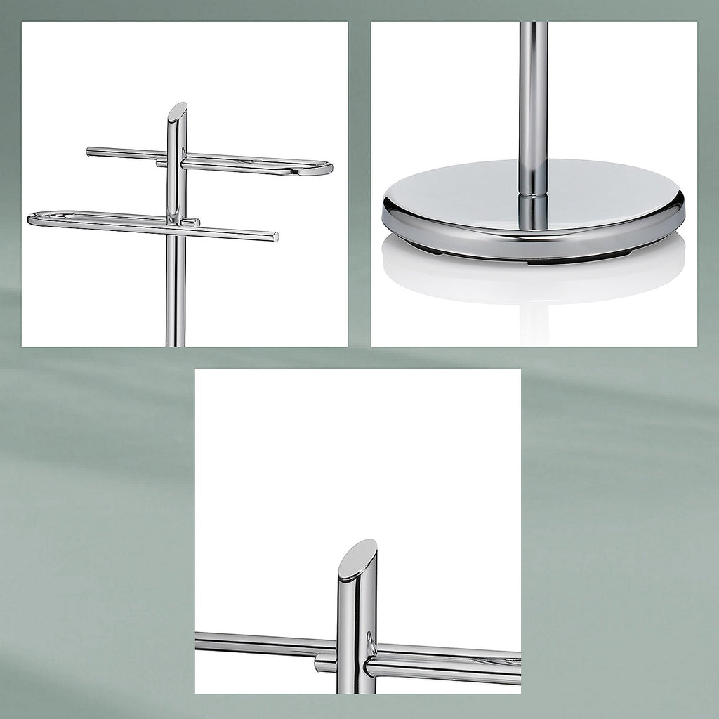 Ken powder-coated metal towel stand in chrome, black or white; rounded base, rod and arms for a modern, dynamic aesthetic. Polished chrome variant: 88 cm height, 25.5 cm base diameter.
