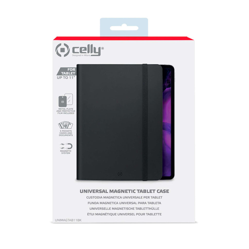 Celly UniMag 11-inch magnetic tablet case: durable protection, secure magnetic closure, integrated stand and carry handle—designed for 11-inch tablets to ensure safe, professional transport and use.