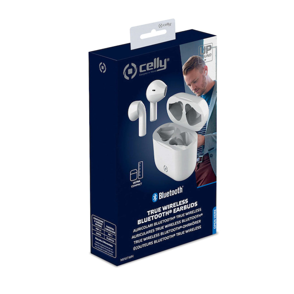Celly UpSound Mini Bluetooth earbuds: compact, lightweight wireless audio with side controls, superior sound, water resistance for sports, and 8-hour battery life, refined reliable listening for adults.