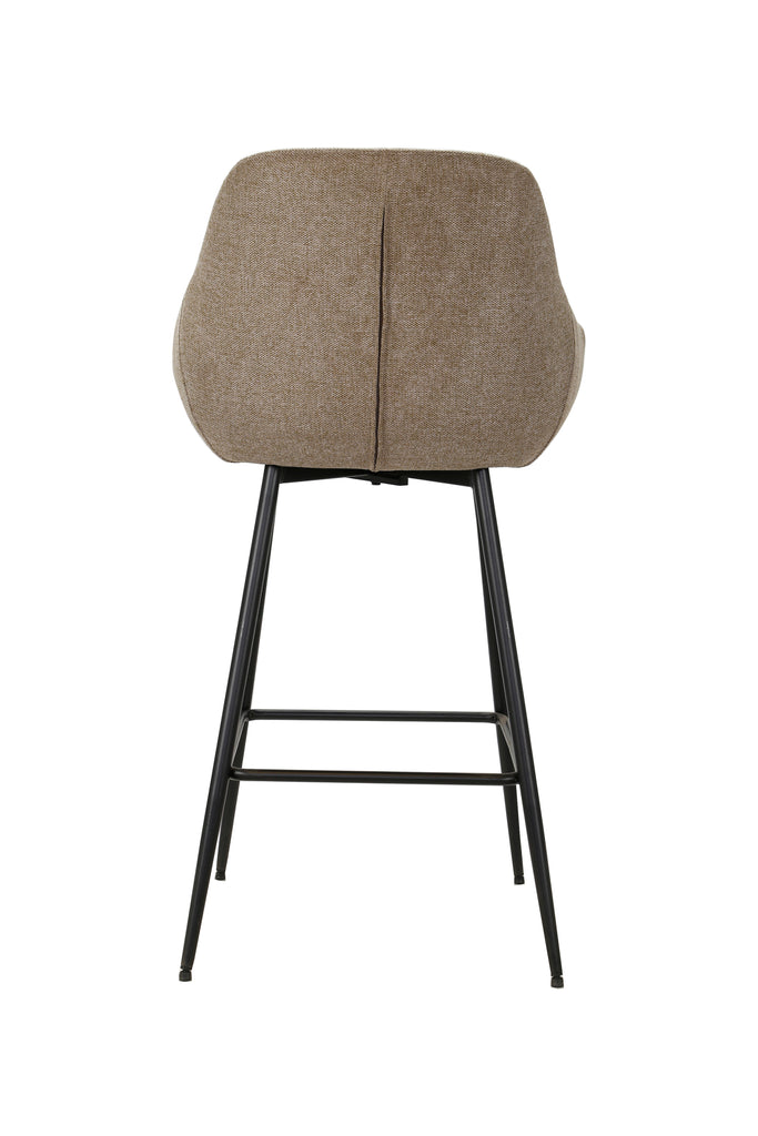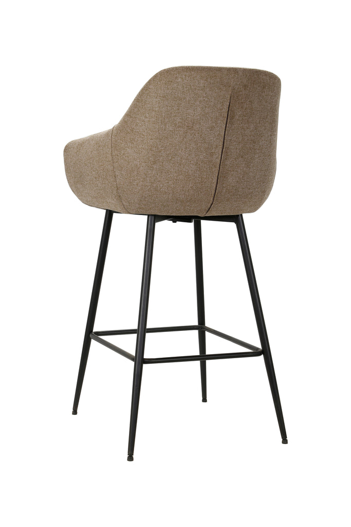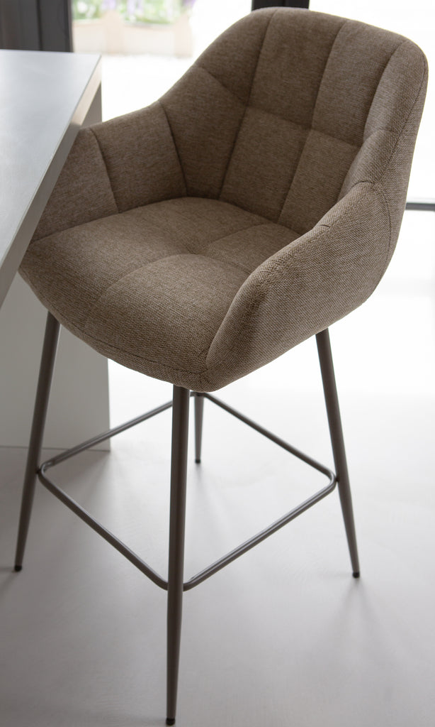 Taupe upholstered bar chair with integrated armrests and black powder-coated frame. Sleek, durable design for kitchen islands, bars and high tables; comfortable seating built for everyday use.