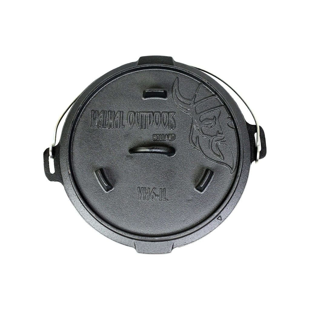 This 6.1-liter Valhal Outdoor Dutch Oven with legs is made of cast iron for versatile cooking. Use it on fire, briquettes, hang it, or as a skillet. Enjoy cooking a variety of dishes.