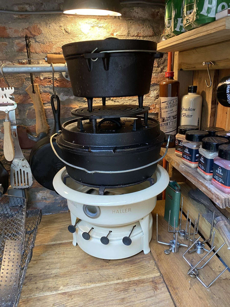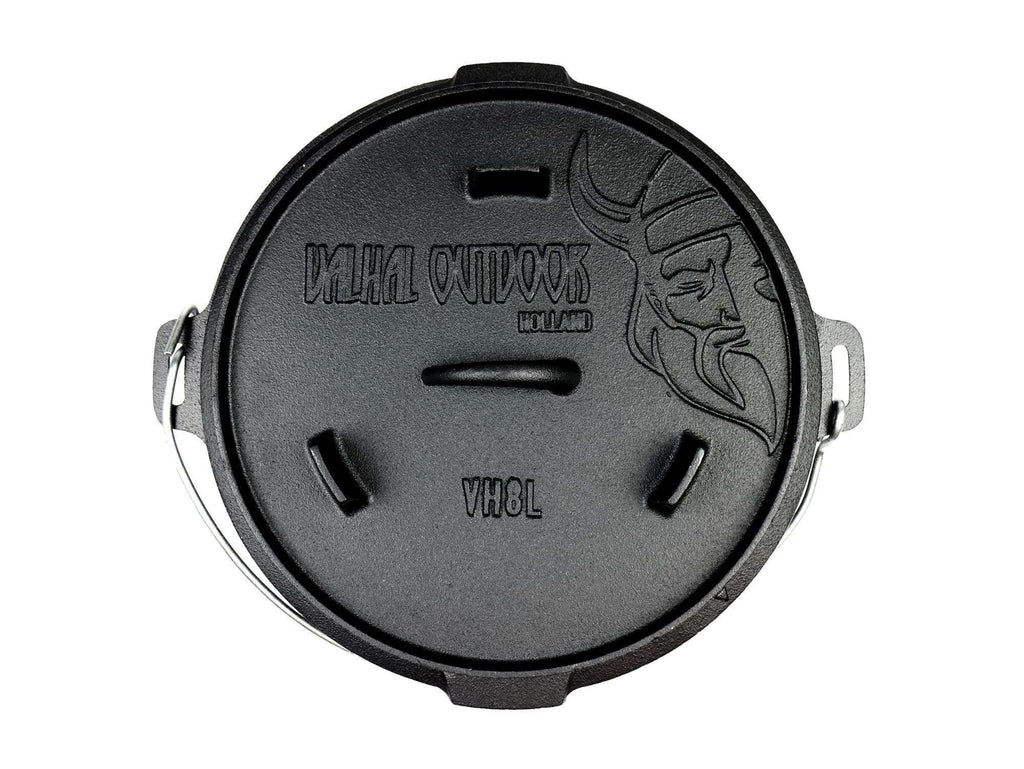The 8-liter Dutch oven from Valhal Outdoor is made of durable cast iron, perfect for various dishes, from stews to baking bread. Its versatile design allows for multiple cooking methods.