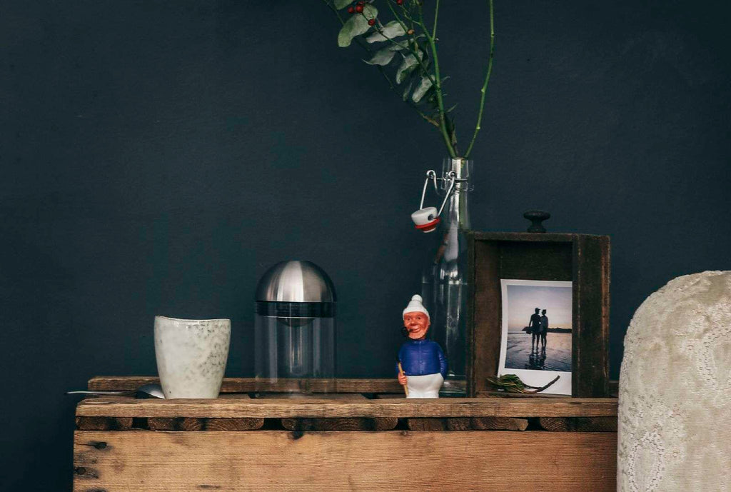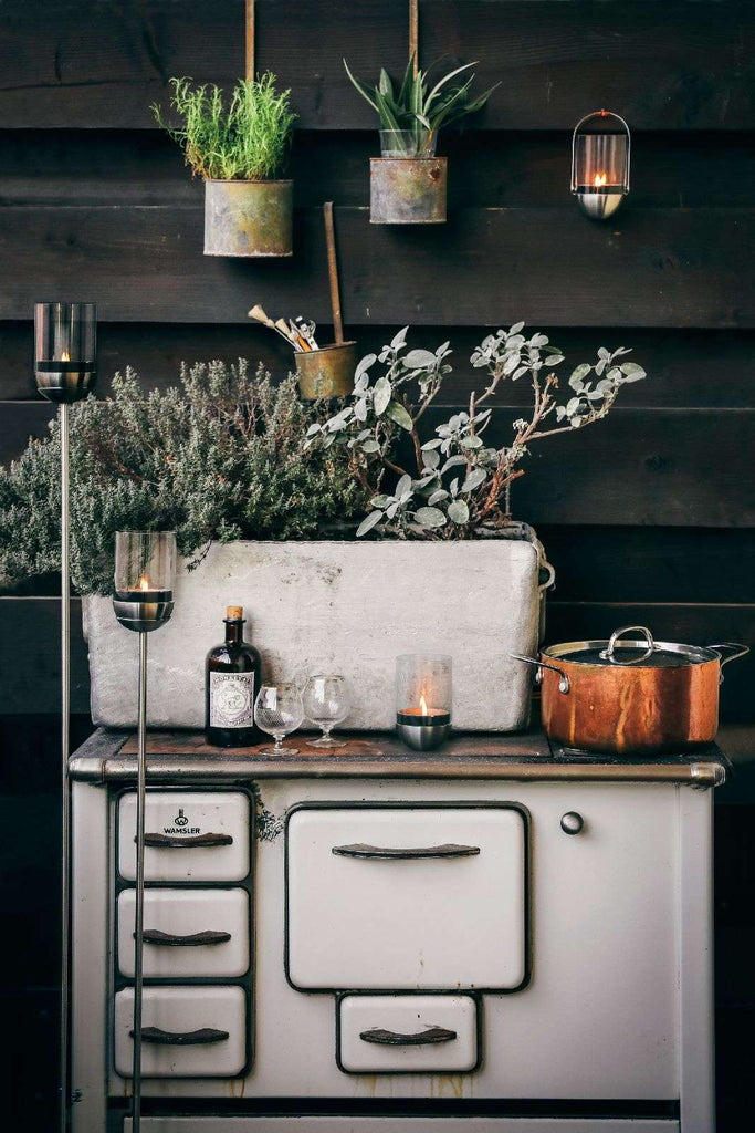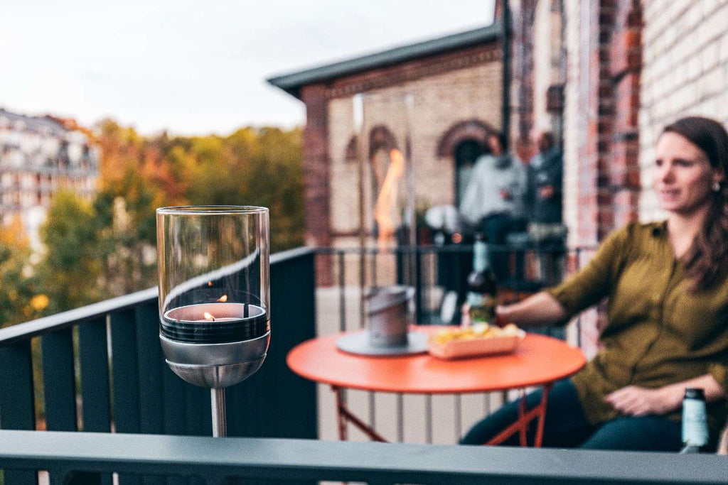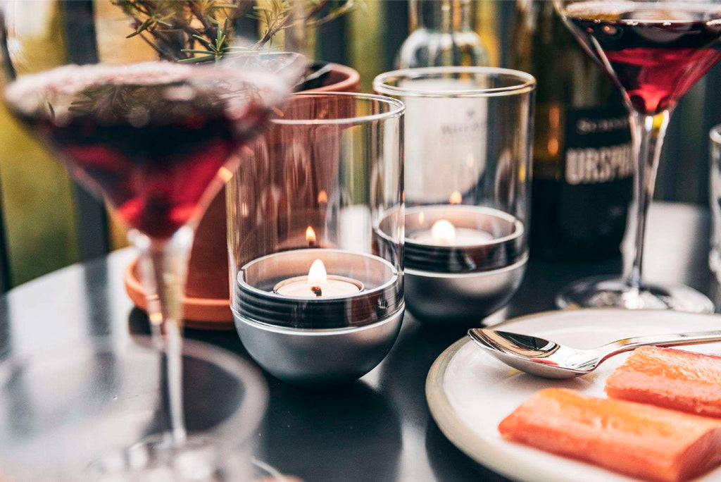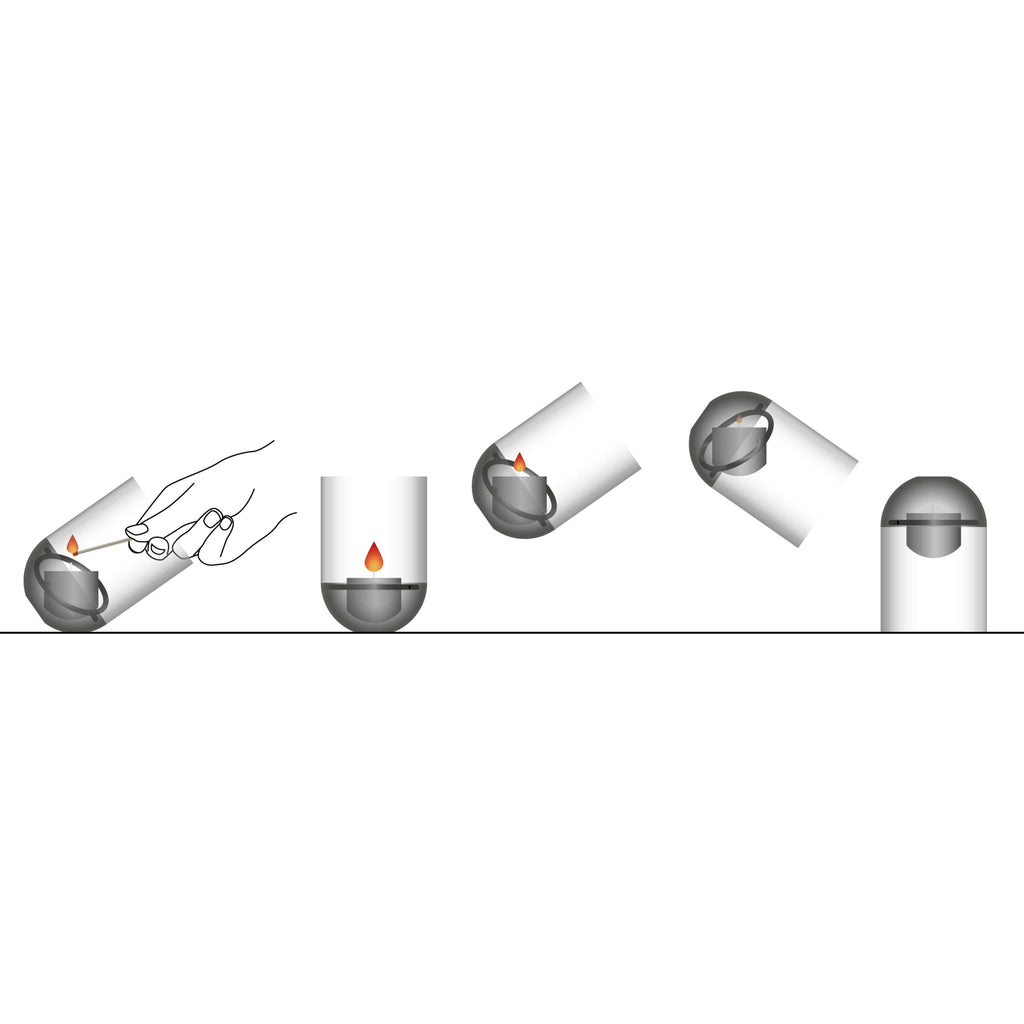 Höfats Gravity Candle M90 — aluminum, Ø8 cm × 13 cm; gravity-stabilized, flip-to-extinguish glass windlight for indoor/outdoor use; German-made, accessory-compatible, award-winning design.