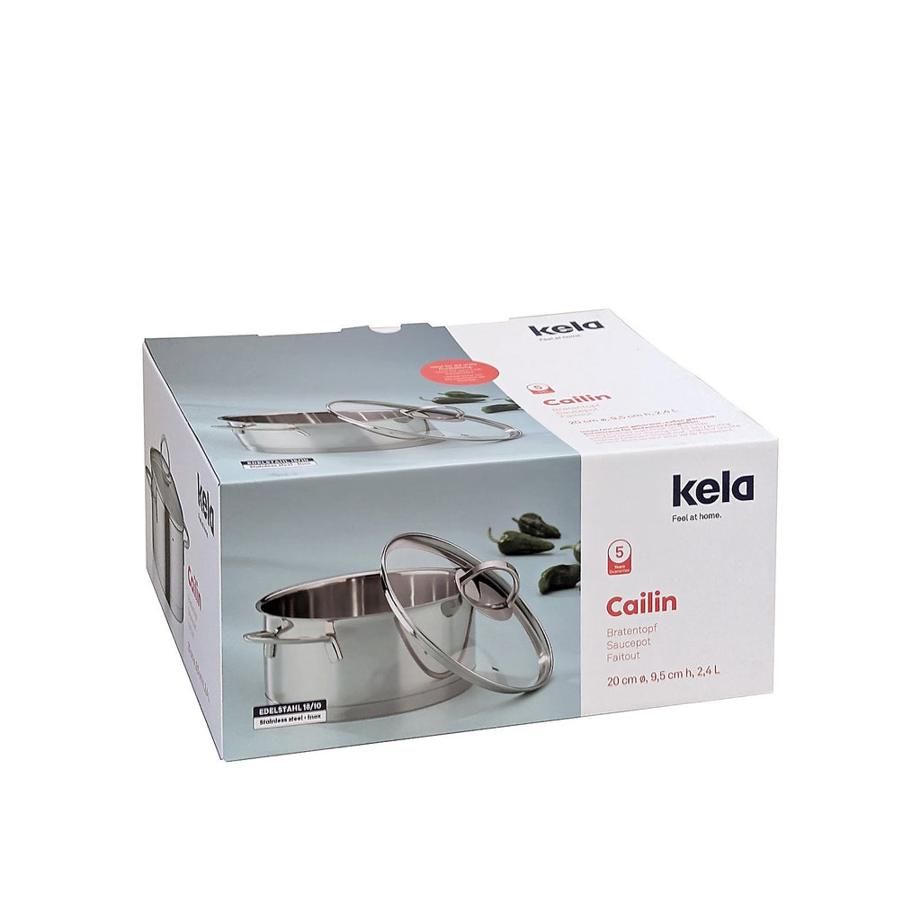 High-quality Cailin stainless steel 18/10 cooking pot with shiny finish, capsule bottom, 0.8 mm thick walls. Comes with glass lid. Suitable for various stovetops and oven up to 180°C. Dishwasher safe.