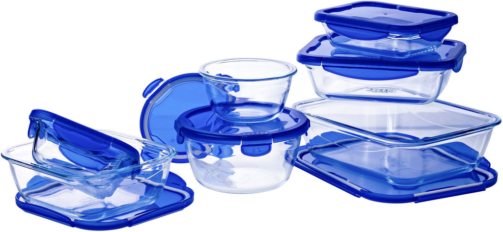 Contenu : 3 plats rectangulaires — 20×15 cm (800 ml), 24×18 cm (1,7 L), 30×23 cm (3,3 L) ; 2 plats carrés — 16×16 cm (800 ml), 21×21 cm (1,9 L) ; 2 plats ronds — ø15 cm (700 ml), ø20 cm (1,6 L).