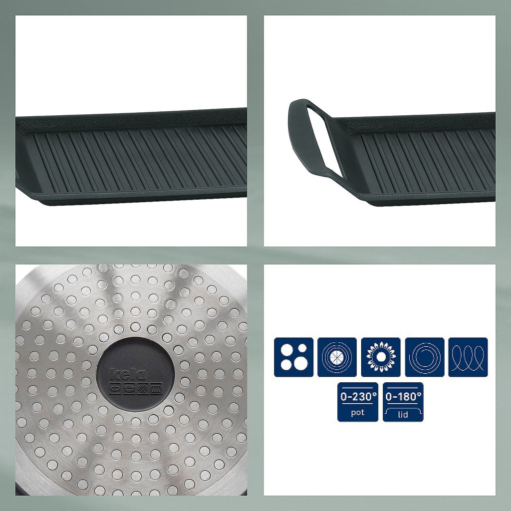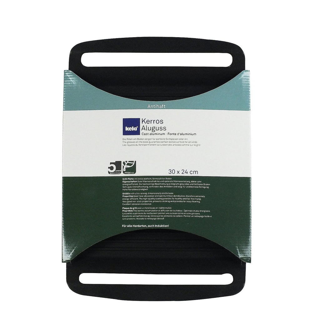 Hoogwaardige grillplaat van gegoten aluminium met 6-sterren coating voor perfecte grillstrepen op vlees en vis: de Kerros grillpan. 5 mm dik met duurzame Greblon-Non-Stick-C3+ coating uit Duitsland voor uitmuntende antiaanbakprestaties, krasbestendigheid en duurzaamheid. Geschikt voor diverse kookplaten en oven tot 180°C. Vaatwasmachinebestendig. 30x24x4 cm.
