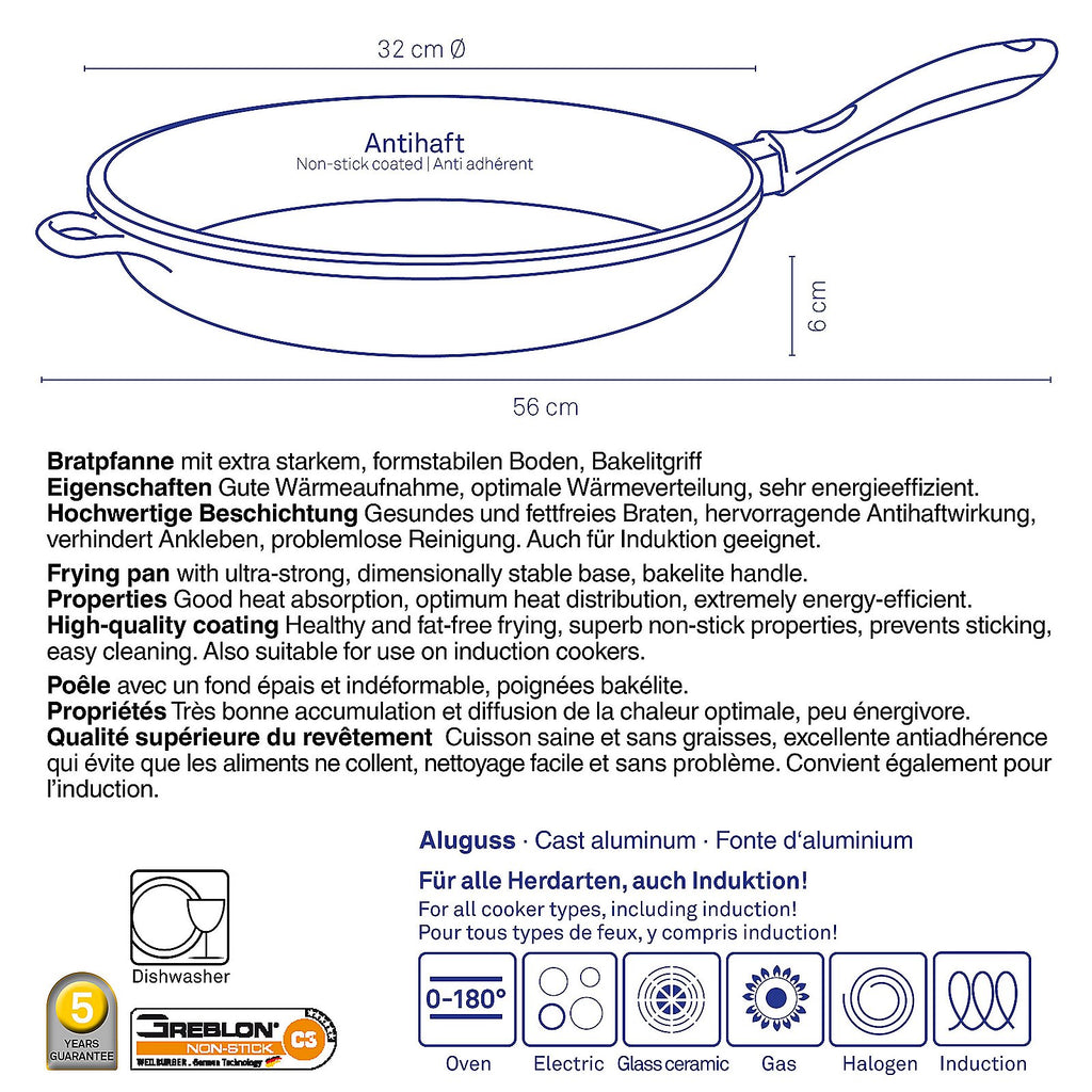 High-quality 6-star Greblon-Non-Stick-C3+ coated cast aluminum pan. 5mm thick with excellent non-stick, scratch-resistant, and durable features. Suitable for various cooktops, oven-safe up to 180°C. 32cm diameter, 6cm height.
