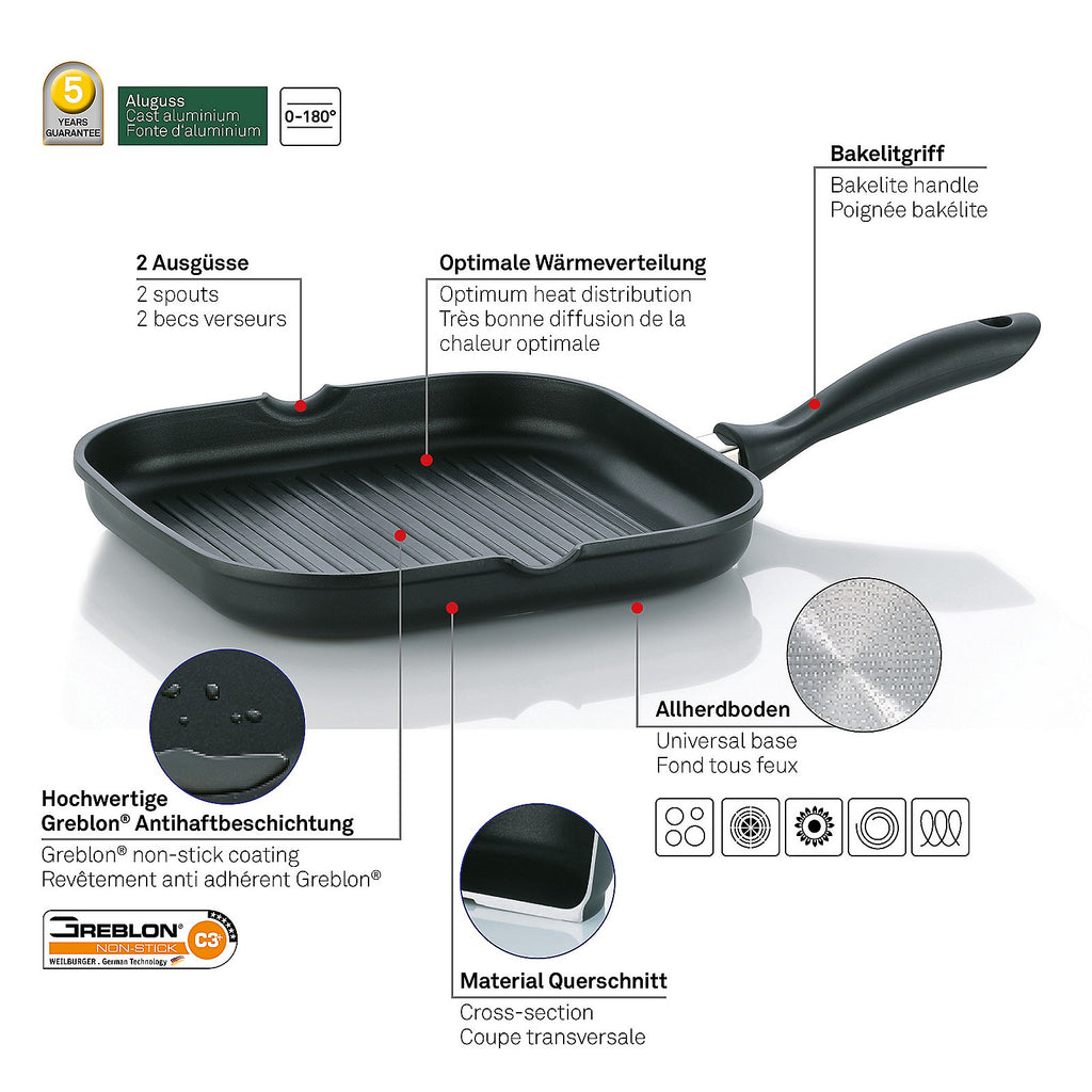 High-quality cast aluminum grill pan with ceramic reinforcement and non-stick coating, 24cm. Suitable for all types of stoves!