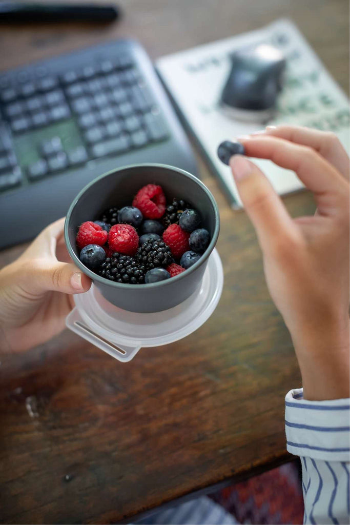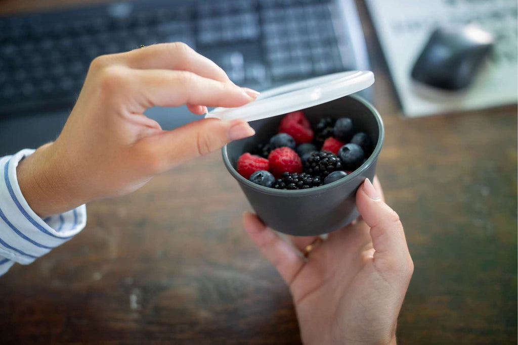 "Koziol Move Dip is perfect for sauces, with a leak-proof lid. It's dishwasher safe, microwaveable, food-safe, recyclable, stackable, and made from innovative, sustainable materials."