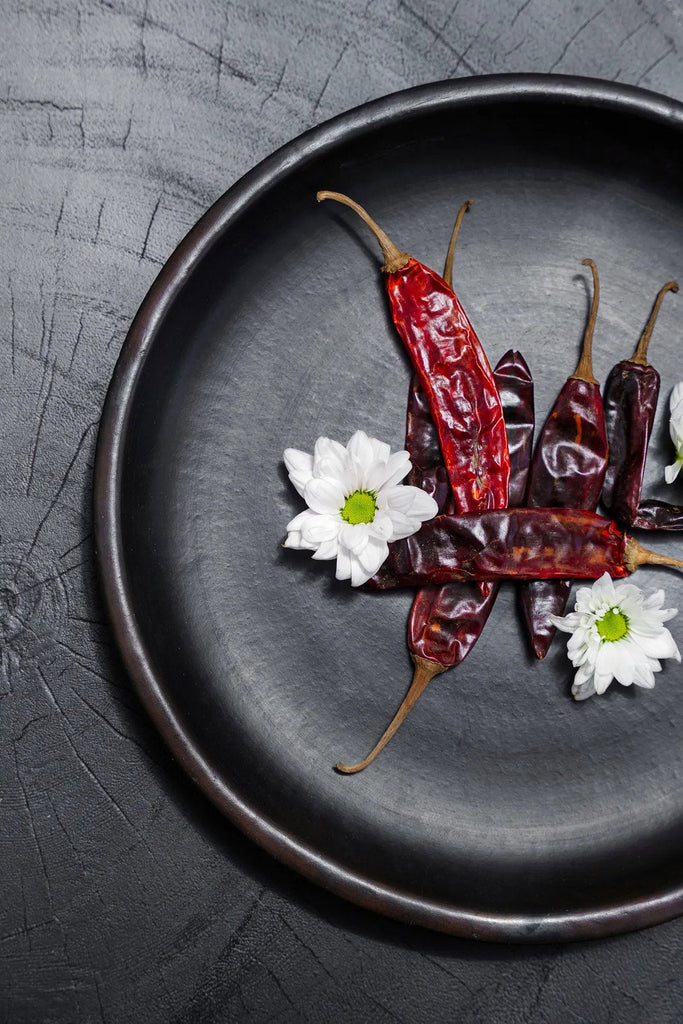 Para brunch, almuerzo o cena: servicio de platos de terracota horneada en negro, de diseño elegante y contemporáneo. Vajilla de terracota, origen Indonesia. Ideal para mesas distinguidas y presentaciones cuidadas.