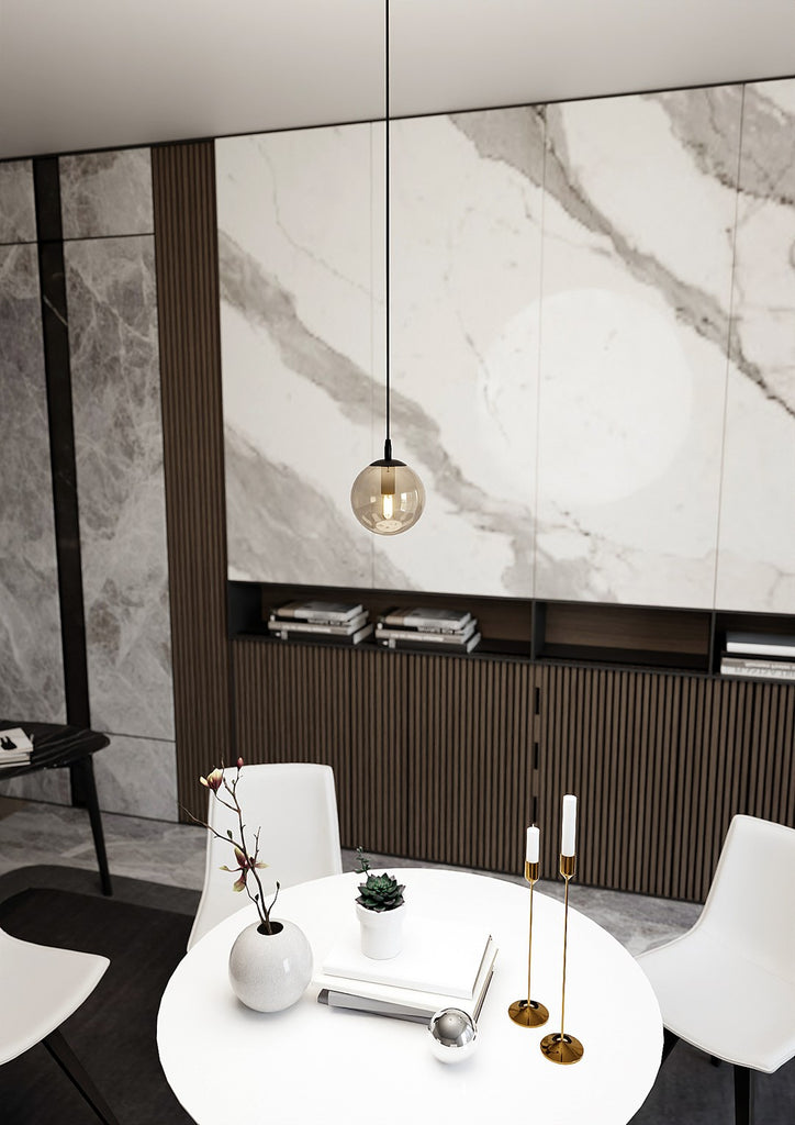 The COSMO ceiling lamp collection blends minimalist style with timeless elegance, featuring trendy glass shades for excellent room illumination. Modern design, adjustable height, powder-coated steel and glass materials.