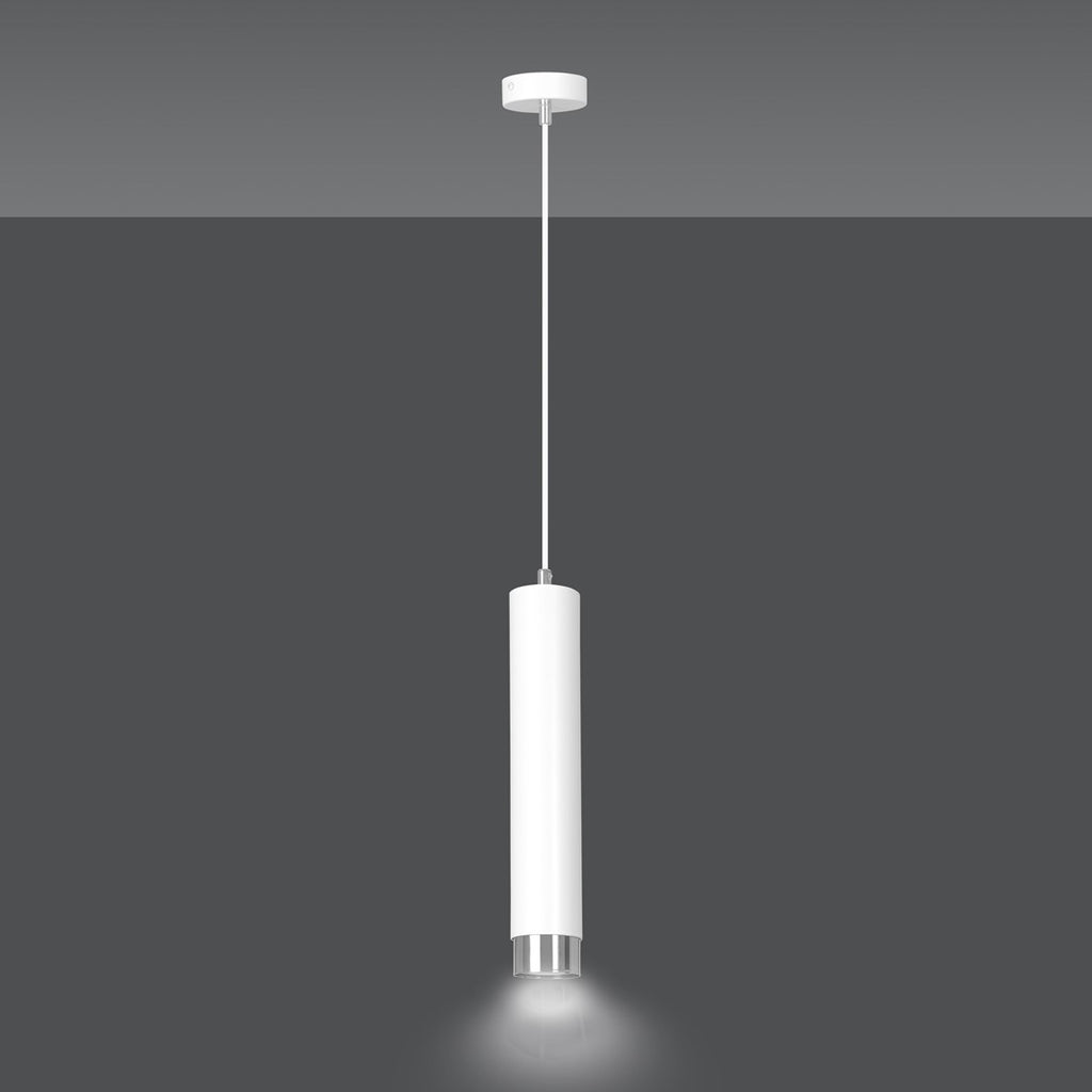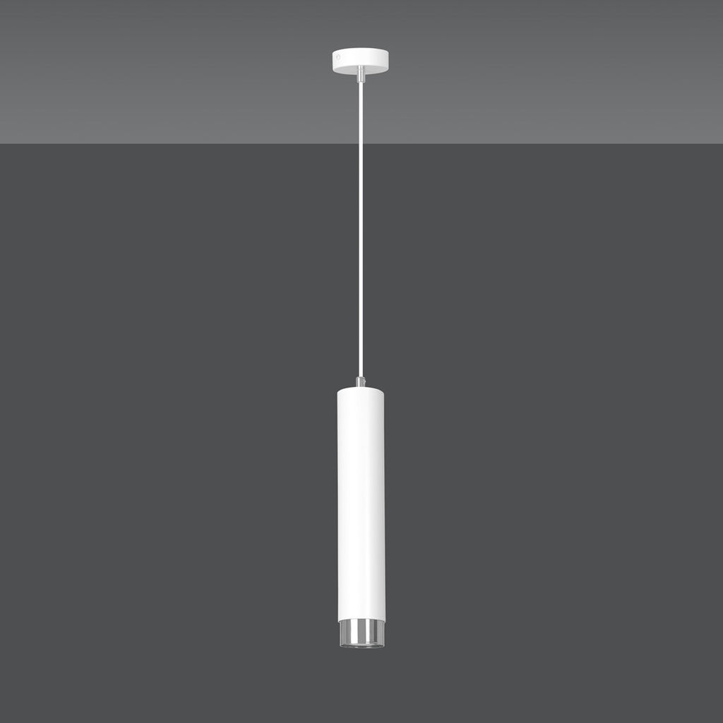 The KIBO pendant lamp features a modern tubular design in metal, available in white or black with gold or chrome accents. Ideal for various interiors.