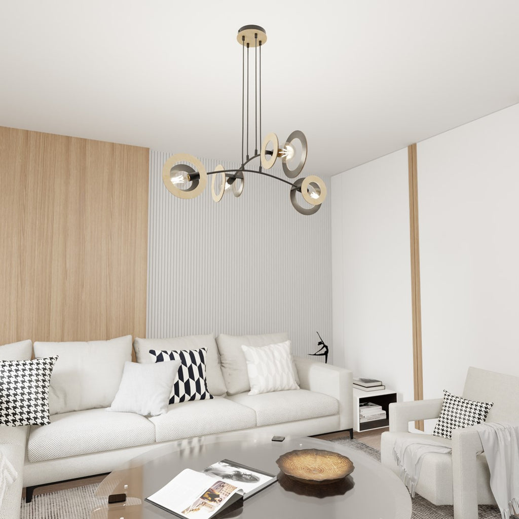 Enhance your space with the Skiva pendant lamp, a blend of metal and plywood, exuding elegance and Scandinavian charm. Emitting a soft glow, perfect for minimalist enthusiasts. Dimensions: W-21", L-86", H-37", weight-5.7 lbs.