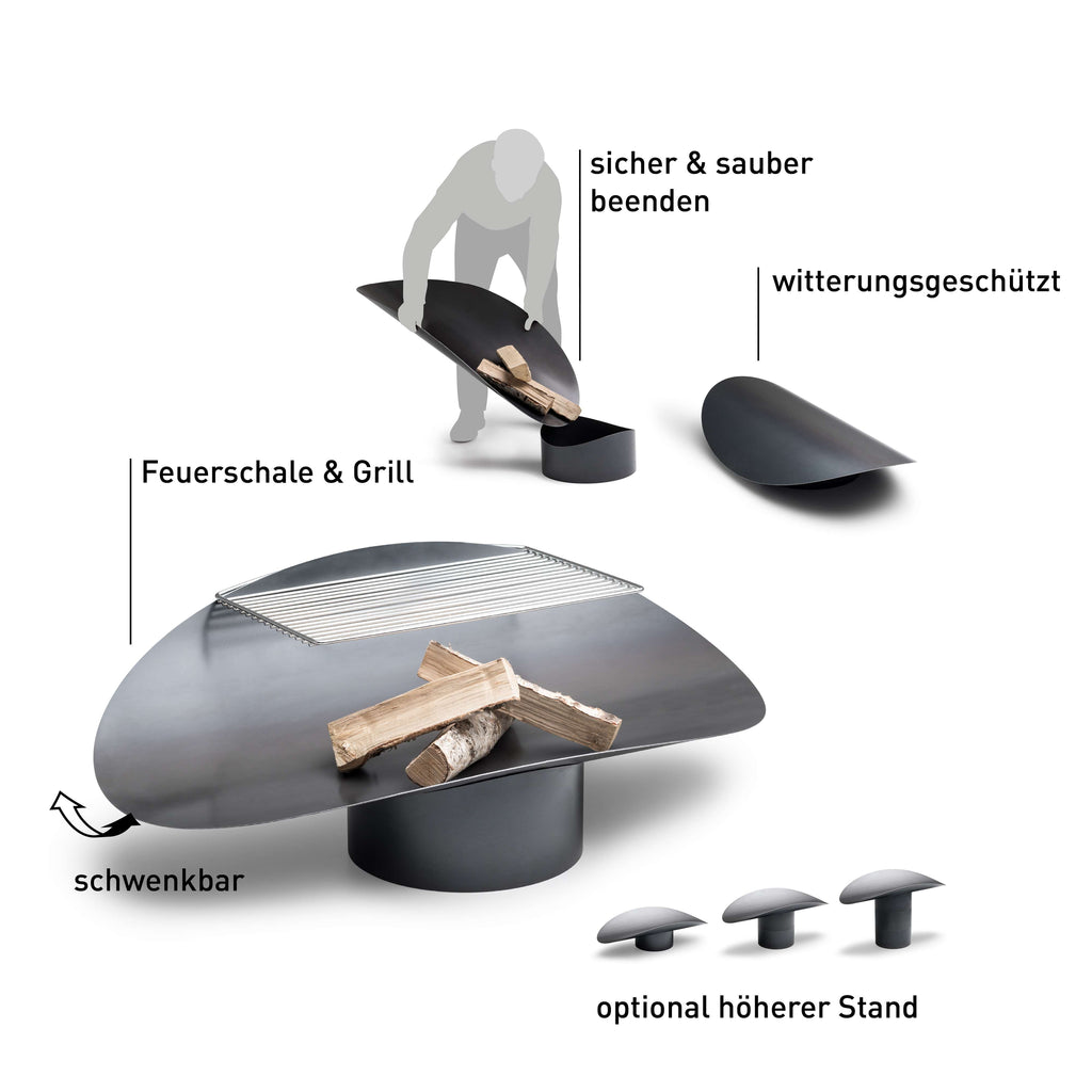 The uniquely shaped Ellipse fire bowl from Höfats enhances any outdoor setting and creates a cozy atmosphere. Known for its multifunctional and distinctive features, the Ellipse sits freely on its base, allowing you to adjust the angle of the bowl and protect the fire from the wind. The base serves another purpose besides stability. When you want to extinguish the fire, simply grab the bowl (with gloves!) and empty the contents into the base. Turn the bowl upside down on the base to cut off the oxygen supply. The fire will be out in no time. With the separately available grill grate, the Ellipse fire bowl can be transformed into a barbecue in seconds, perfect for grilling meat, vegetables, and more. Clamped to the high rim of the bowl, a cozy campfire can instantly turn into a barbecue party.
