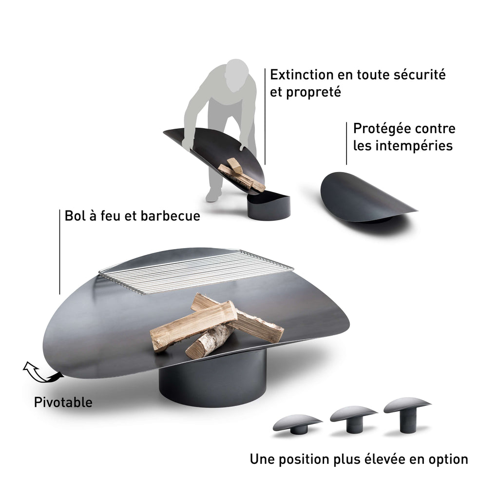 La vasque à feu Ellipse de forme unique de Höfats rehausse tout environnement extérieur et crée une atmosphère chaleureuse. Connu pour ses caractéristiques multifonctionnelles et distinctives, l'Ellipse repose librement sur sa base, vous permettant d'ajuster l'angle de la vasque et de protéger le feu du vent. En plus de sa stabilité, la base sert à éteindre le feu. Il suffit de saisir la vasque (avec des gants !) et de vider le contenu dans la base. Retournez ensuite la vasque sur la base pour couper l'oxygène. Le feu s'éteindra en un rien de temps. Avec la grille de barbecue disponible séparément, la vasque à feu Ellipse peut se transformer en barbecue en quelques secondes, idéale pour griller de la viande, des légumes, et plus encore. Fixée au rebord de la vasque, un feu de camp convivial peut rapidement se transformer en une fête barbecue.