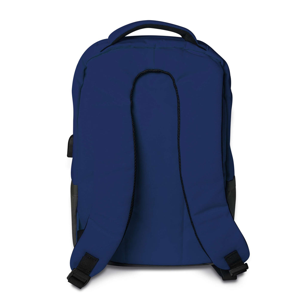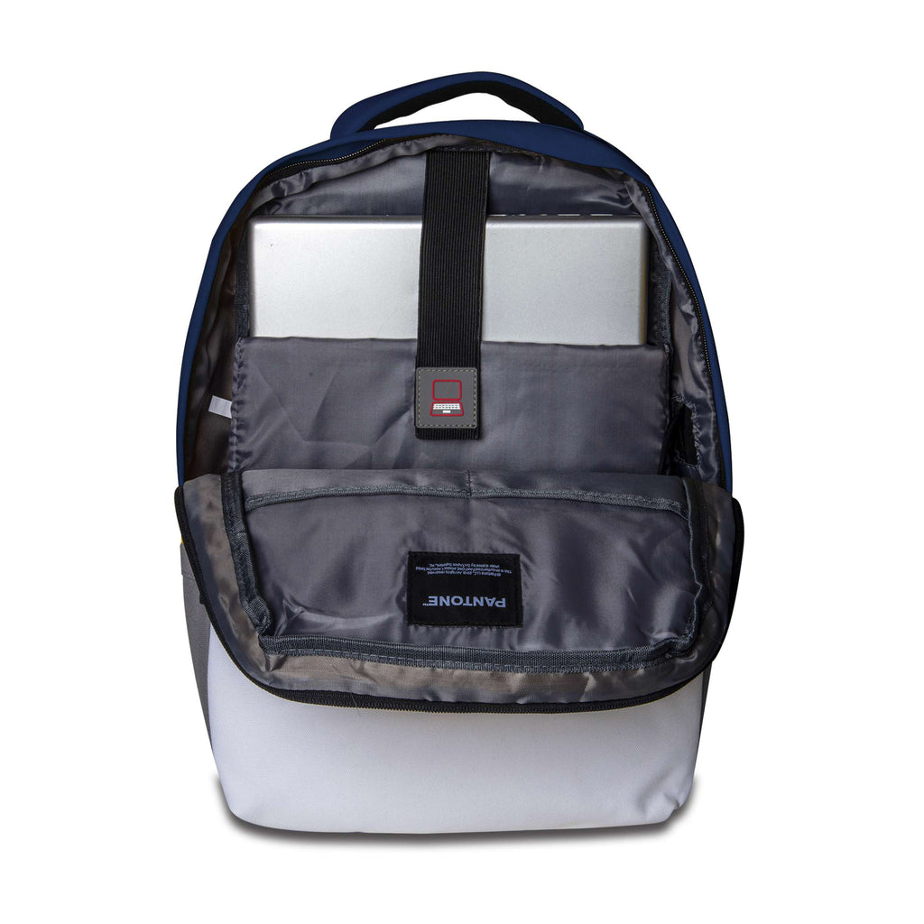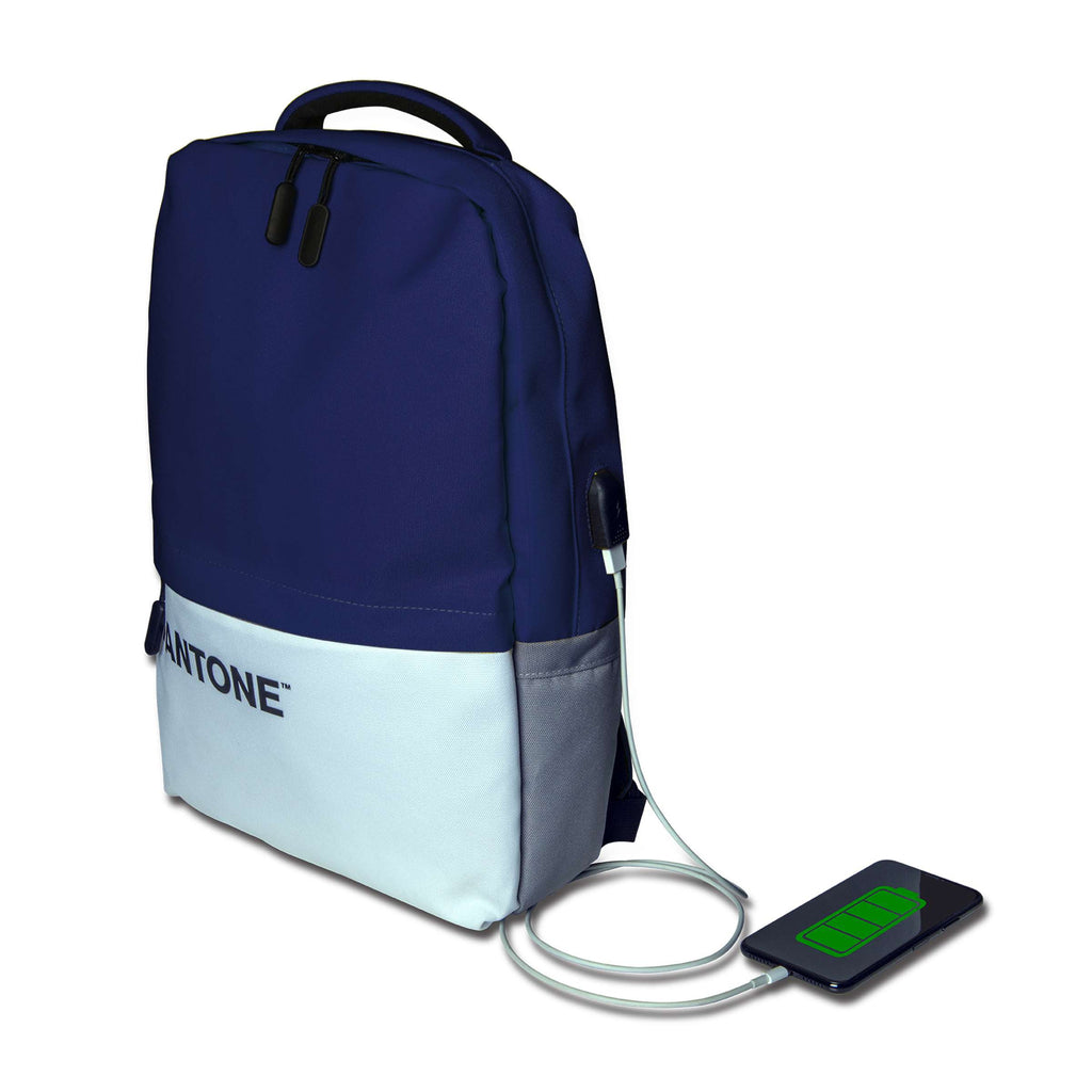 Pantone Dark Blue/White backpack — durable polyester, padded laptop compartment, adjustable shoulder straps, integrated USB charging cable; available in multiple colorways. Not machine washable.