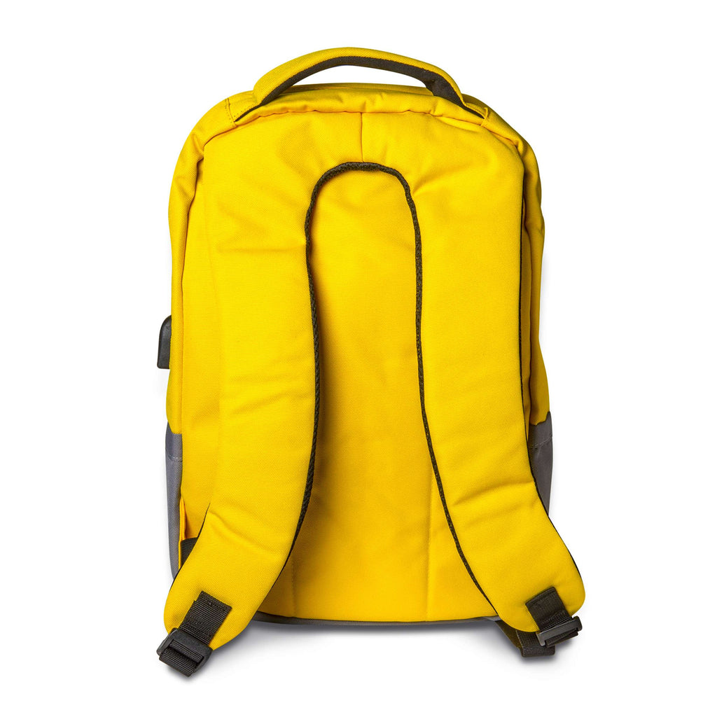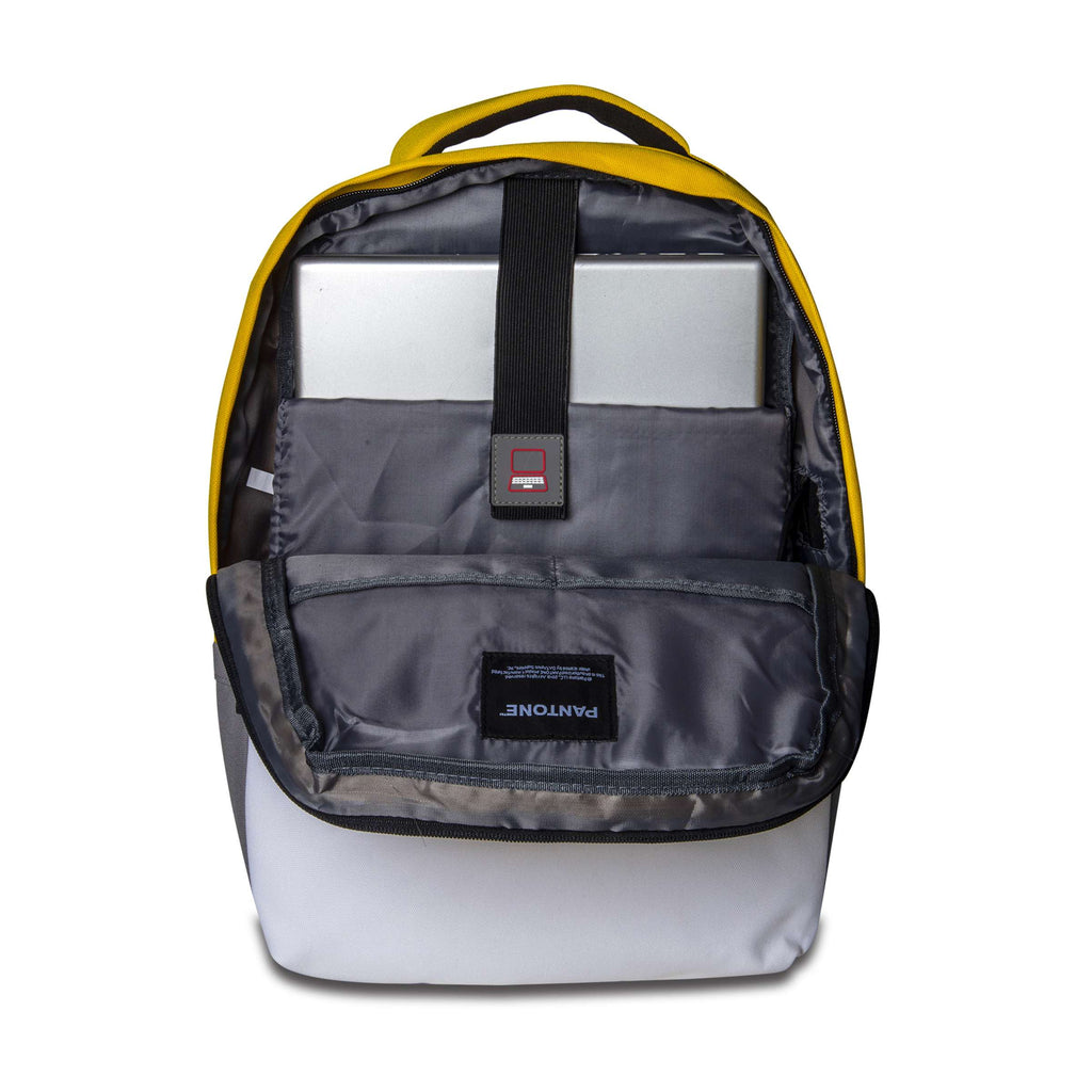 Pantone Yellow/White backpack: durable polyester, padded interior, adjustable straps, USB charging cable, laptop-friendly, available in additional colorways; not machine-washable — stylish, travel-ready carry-all.