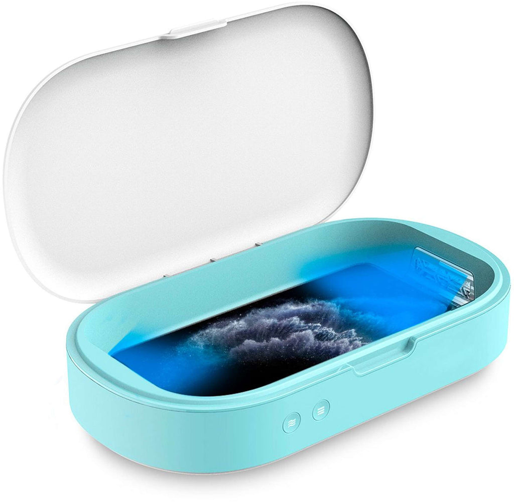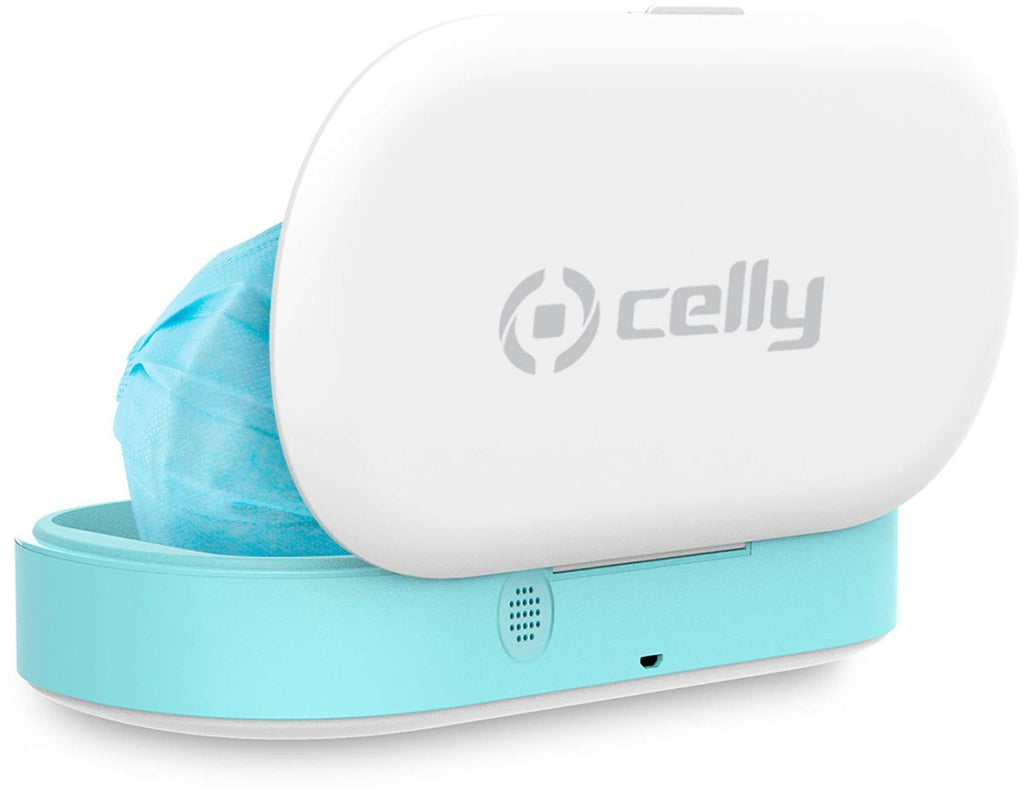 Celly ProSterilizer: compact USB-powered UV sterilizer eliminating 99% of bacteria (5 minutes); portable, fragrance slot; validated against E. coli and S. aureus. CE-, RoHS/REACH-compliant. Power adapter sold separately.